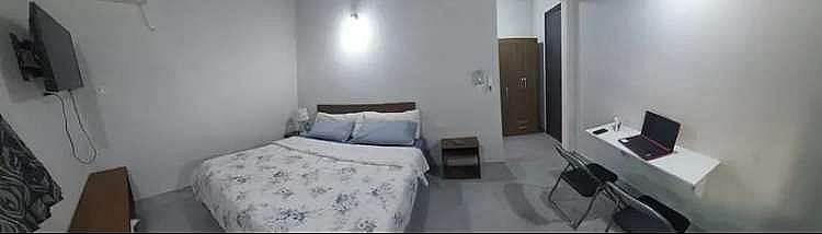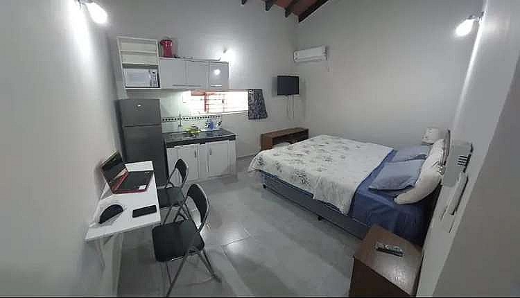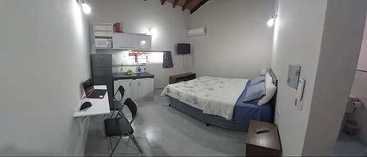 Descripción HERMOSO MONOAMBIENTE SUPER EQUIPADO SUPERFICIE PROPIA: 21m2 - AREA COMUN DE ESPARCIMIENTO: 70 m2 Cuenta con: -Cama Queen size -2 mesitas de luz a los lados de la cama -lavadero para vajilla y mueble de cocina -Heladera -Horno microondas -TV plasma -Ventilador de techo -Aire acondicionado tipo Split -Internet wifi -Placar -Termo calefón -Mesita empotrada con 2 sillas plegadizas -Agua y Luz incluidos -Lavandería común -Área común / Patio con sillón, mesas, sillas y parrilla -NO TIENE COCHERA